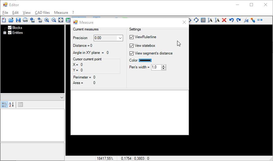 After opening an existing drawing or creating a new one, click any button in the Measure tab to open RulerForm window. It’s a CAD .NET form written to configure and show values of Measurement tools. (For adding and configuring measurement tools to your project, please follow to UseMeasuresDemo).